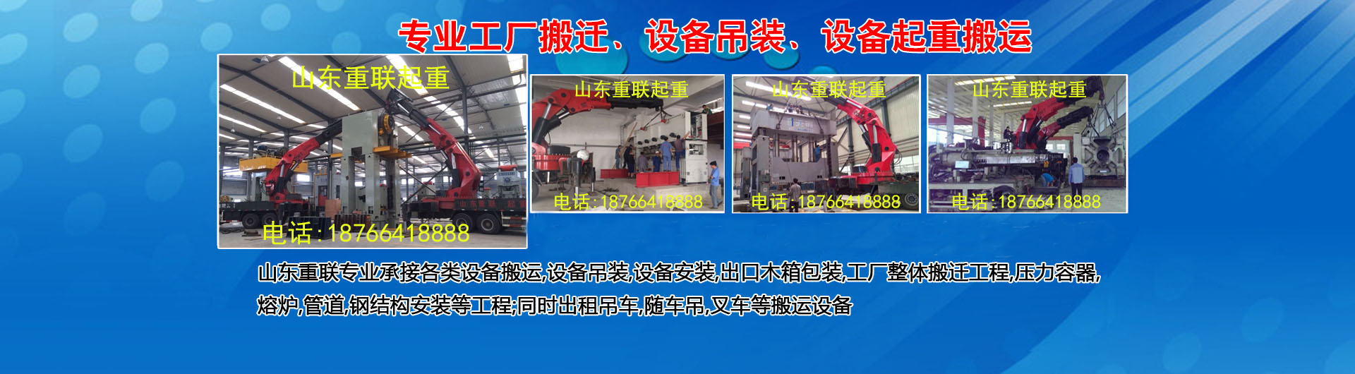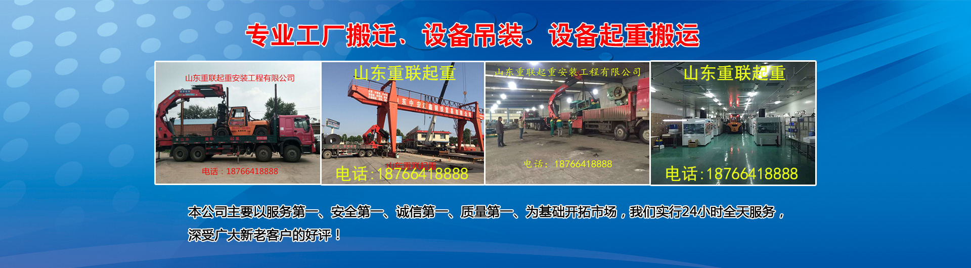 山東重聯(lián)起重安裝工程有限公司(原兔兔搬運(yùn)公司)成立于2004年8月。公司設(shè)立在濟(jì)南市高新區(qū)孫村鎮(zhèn)辛莊167號(hào)。注冊(cè)資金4000萬(wàn)元,公司自有資產(chǎn)3000萬(wàn)元是一家重資產(chǎn)運(yùn)營(yíng)公司。現(xiàn)已濟(jì)南地區(qū)規(guī)模較大的起重搬遷企業(yè)。 公司主營(yíng):工廠(chǎng)、企事業(yè)單位搬遷、1-600T各類(lèi)設(shè)備起重吊裝搬運(yùn)、高空作業(yè)車(chē)租賃。可根據(jù)各種特殊搬遷起重作業(yè)需求,公司特別制定不同的搬遷起重專(zhuān)用方案和工具為客戶(hù)服務(wù)。公司可組織大型搬遷和起重吊裝施工方案的專(zhuān)家組論證。 公司擁有專(zhuān)業(yè)工程技術(shù)人員48人,外協(xié)80余人均有100萬(wàn)意外險(xiǎn),其中擁有訓(xùn)練有素、經(jīng)驗(yàn)豐富、持特種操作證的30余人。包括叉車(chē)證、吊車(chē)證、司索工、信號(hào)工、電工、電氣焊工、安全員等專(zhuān)業(yè)的技術(shù)人員...